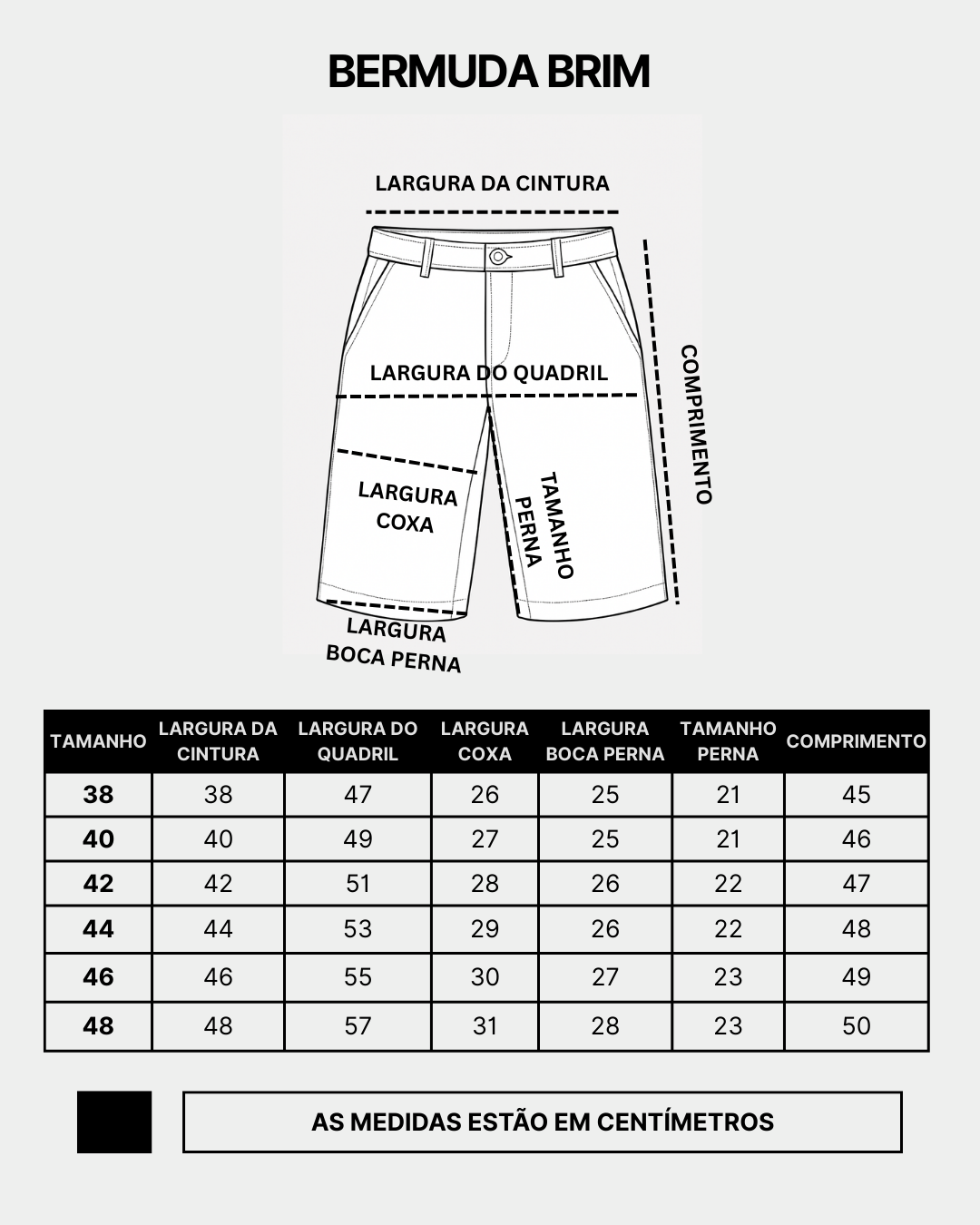 - Composição: 100% Algodão do tipo Brim